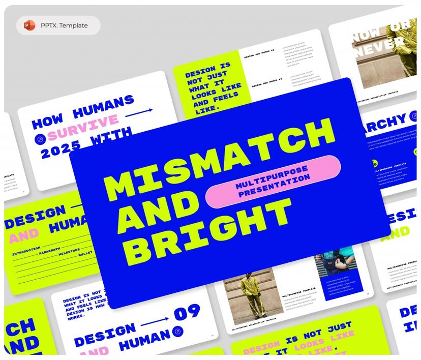 Apply this trend in minutes: Finding the right balance with bold colors can be tricky. A professionally designed template does the work for you. The Mismatch and Bright Multipurpose PowerPoint Presentation uses a stunning, high-contrast color palette that feels energetic and joyful without being overwhelming.