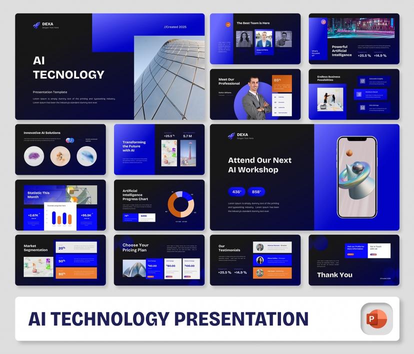 Apply this trend in minutes: To capture this sophisticated, tech-forward feel, you need a template built with it in mind. The Dexa – AI Technology PowerPoint Presentation Template uses bold, dark backgrounds and striking geometric patterns to create a sense of cutting-edge innovation from the very first slide.